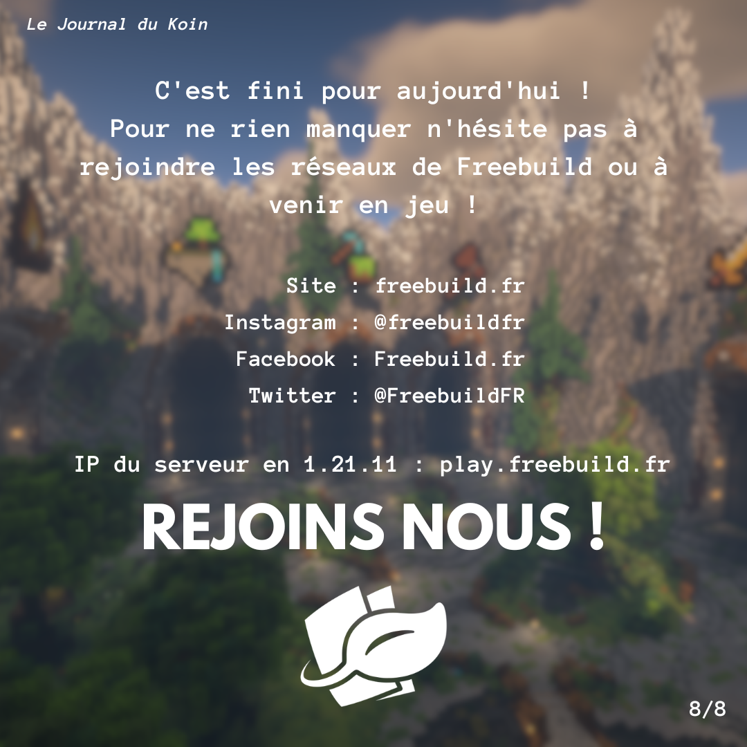 Koin, on se retrouve en ce mois festif pour un nouveau numéro un peu spécial. En effet, il s'agit des 10 ans du serveur ce mois-ci ! Bonne lecture et encore bon anniversaire Freebuild ! C'est tout pour aujourd'hui mais pas d'inquiétude on se retrouve le mois prochain pour un nouveau numéro de votre journal favori. N'hésitez pas à me proposer des demandes d'interviews ou d'annonces (tout serveur confondu), je suis preneur !
