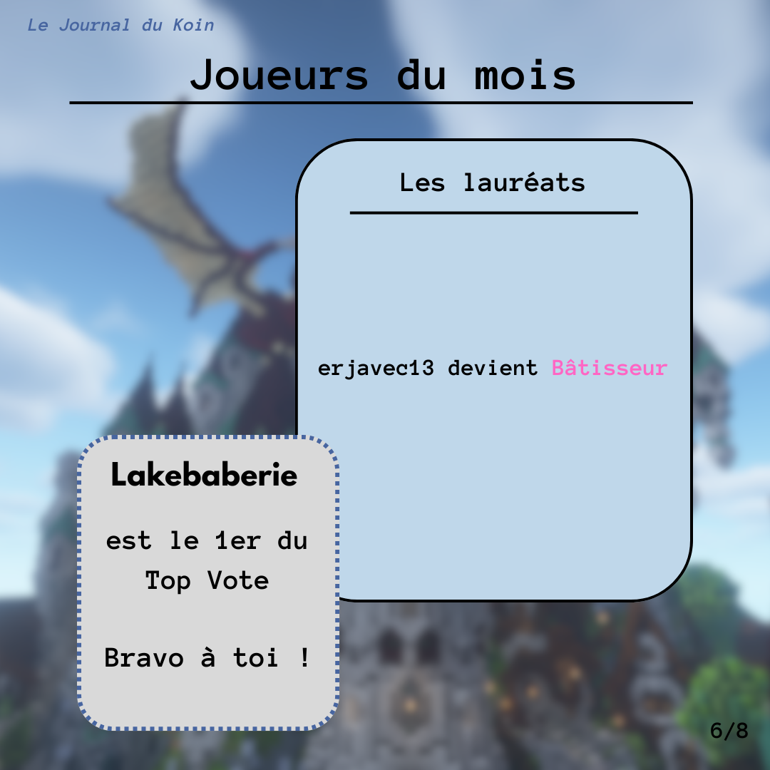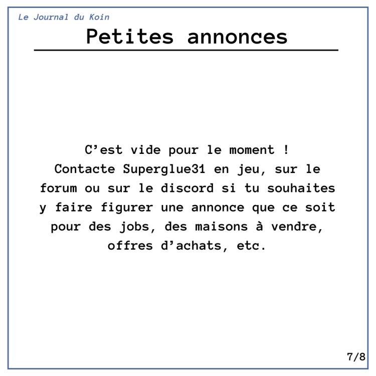 Koin, on se retrouve ce mois-ci après quelques vacances pour un nouveau numéro de votre journal favori. Bonne lecture ! C'est tout pour aujourd'hui mais pas d'inquiétude on se retrouve le mois prochain pour un nouveau numéro. N'hésitez pas à me proposer des demandes d'interviews ou d'annonces (tout serveur confondu), je suis preneur !