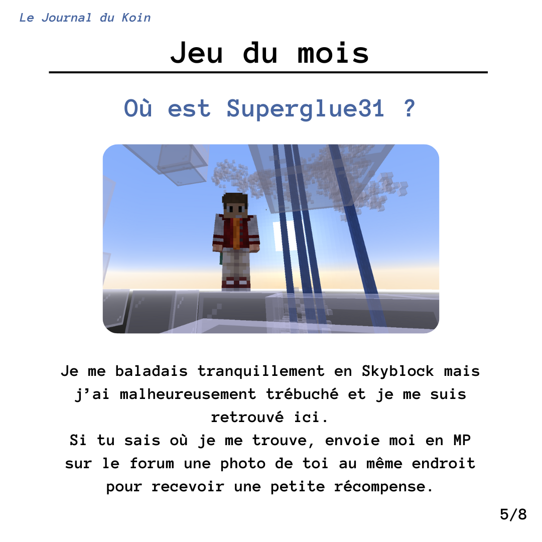 Koin, on se retrouve ce mois-ci pour un nouveau numéro de votre journal favoris. Bonne lecture ! Je rajoute aussi que le jeu du mois dernier est encore disponible jusqu'au prochain numéro, n'hésitez pas à tenter votre chance ! C'est tout pour aujourd'hui mais pas d'inquiétude on se retrouve le mois prochain pour un nouveau numéro. N'hésitez pas à me proposer des demandes d'interviews ou d'annonces (tout serveur confondu), je suis preneur !