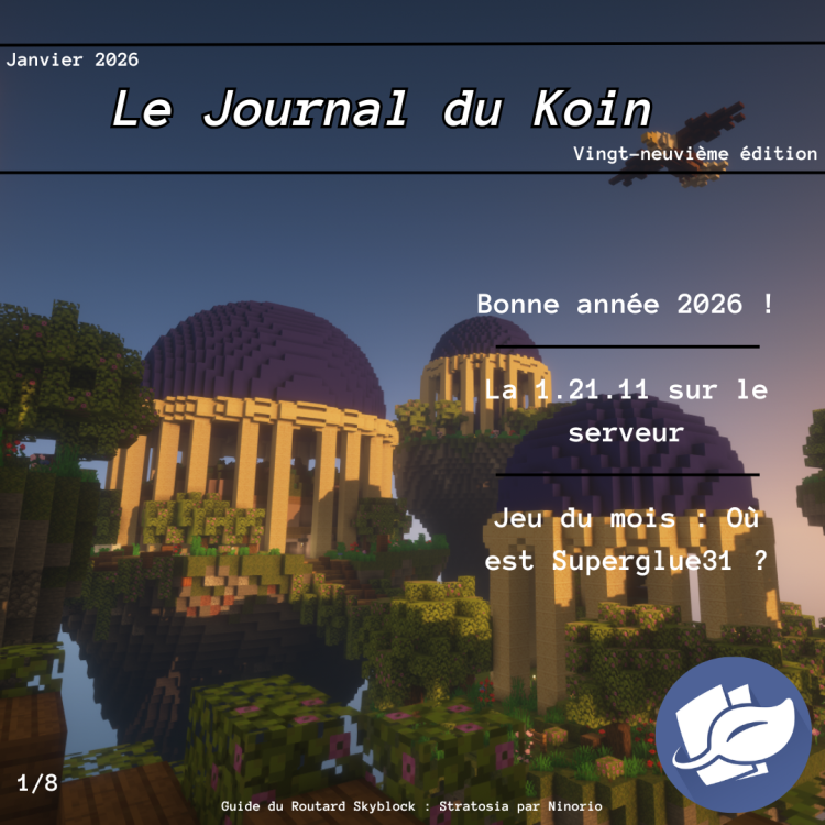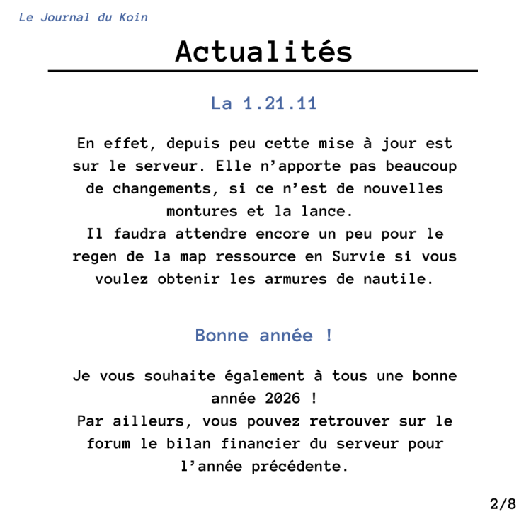 Koin, premièrement bonne année 2026 à tous et sans plus attendre un nouveau numéro de votre journal favori ! C'est tout pour aujourd'hui mais pas d'inquiétude on se retrouve le mois prochain pour un nouveau numéro ! N'hésitez pas à me proposer des demandes d'interviews ou d'annonces (tout serveur confondu), je suis preneur !