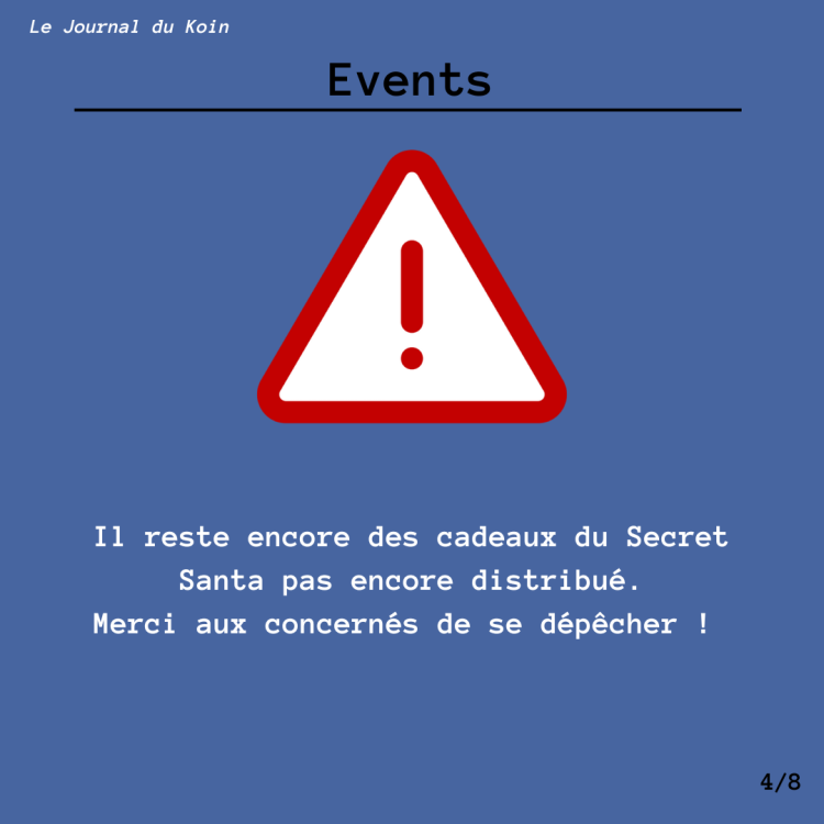 Koin, tout d'abord merci aux participants du jeu du mois novembre (pensez à regardez vos mails pour certains ) et en espérant vous voir encore plus nombreux pour le prochain. Sur ce, bonne lecture ! C'est tout pour aujourd'hui mais pas d'inquiétude on se retrouve l'année prochaine pour un nouveau numéro de votre journal favori. Passez de bonnes fêtes de fin d'année ! N'hésitez pas à me proposer des demandes d'interviews ou d'annonces (tout serveur confondu), je suis preneur !