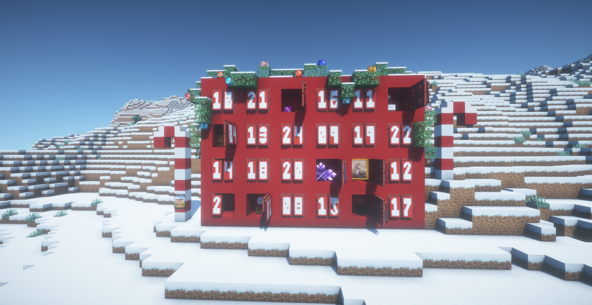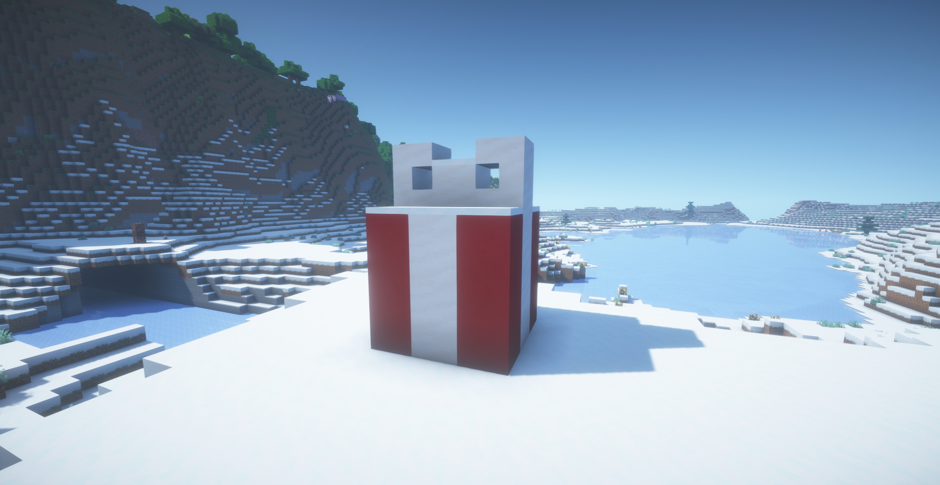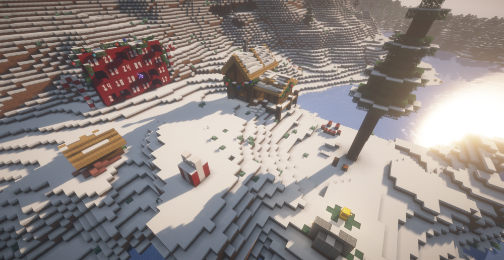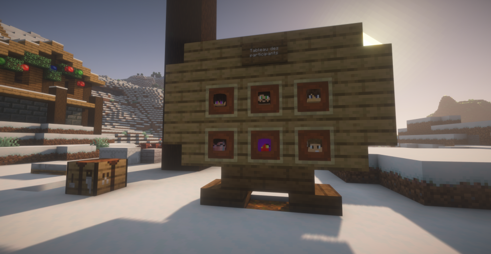Koin à tous ! On se retrouve aujourd'hui pour la présentation de la 97ème édition du spawn ressource. Ce mois-ci le spawn ressource est situé dans un biome plaines enneigées. /!\ Le grief et le vol de ressource du spawn ressource est interdit sous peine de ban permanent /!\ Rappel du concept Vue globale Participants Merci aux participants de ce spawn ressource : @Patoche_Balkany, @Sh4doW98, @Fordos19, @Ninorio, @Mister_Ju2222 & @Superglue31. Le tableau des participants a été réalisé par @Superglue31. Constructions Directement en sortant du portail à gauche et en regardant sur la gauche vous trouverez un petit cadeau réalisé par @Fordos19. En poursuivant vous trouverez une petite chaumière construite par @Ninorio. Ensuite, vous tomberez nez à nez avec un calendrier de l'Avent géant réalisé par @Mister_Ju2222. Maintenant sur la droite, vous trouverez une ferme à XP construite par @Patoche_Balkany. Et pour finir, après une petite balade vers le sud, vous trouverez une île champignon totalement artificielle créée par @Sh4doW98. C'est tout pour cette 97ème édition, merci encore aux participants et à bientôt sur Freebuild !